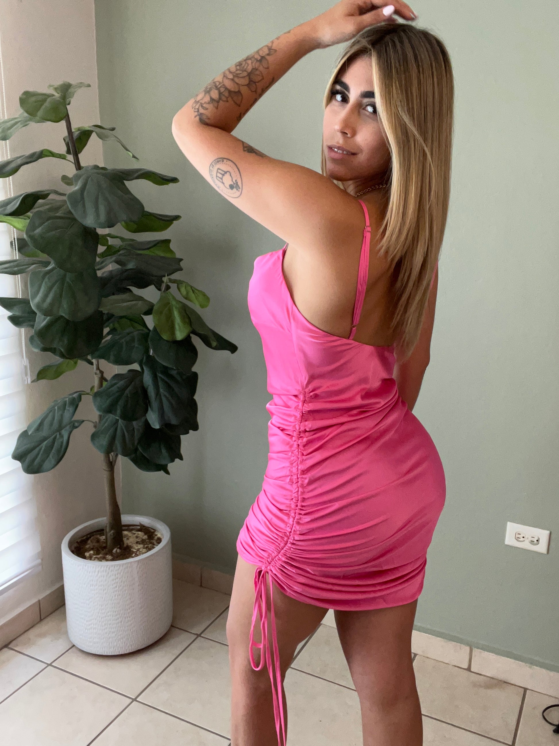 Pink adjustable dress, runs true to size. Model is wearing size Small.