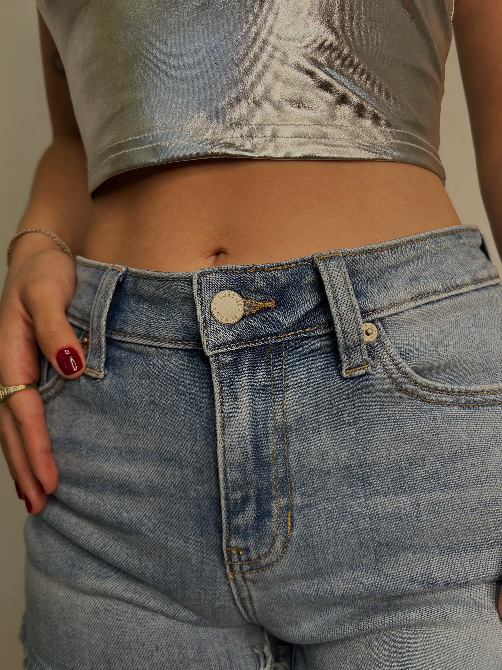 Denim jean shorts in light wash. Runs to size, model is wearing a size small.