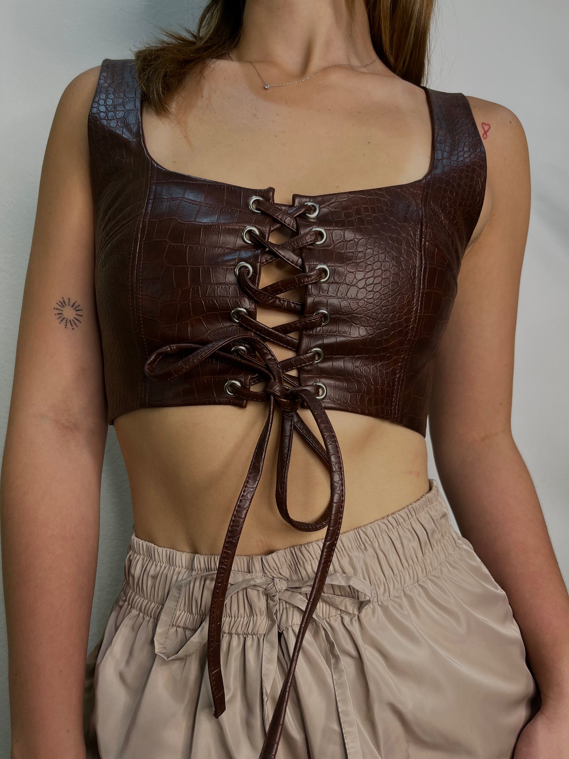 Square neck laced front leather crop top. Comes in brown and cream colors. Runs to size. Model is wearing a size small.