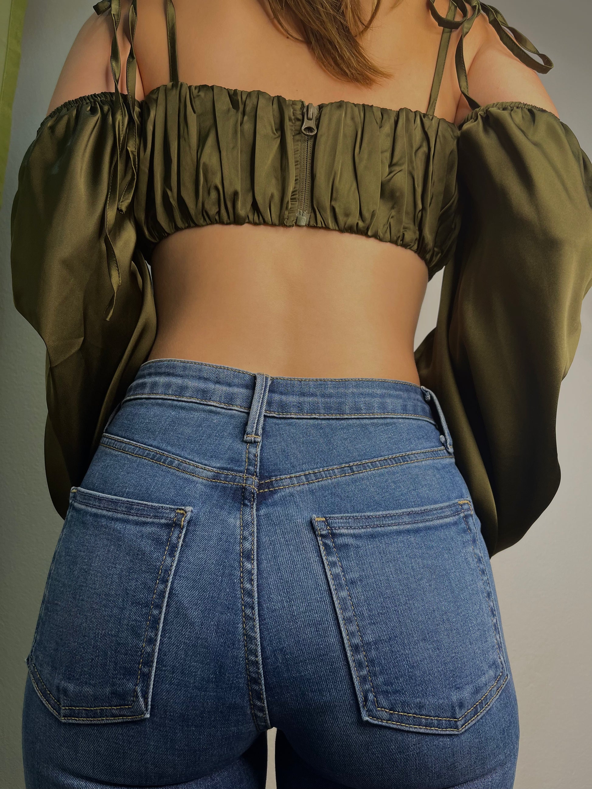 Satin double shoulder crop top in olive. Runs to size. Model is wearing a size small.