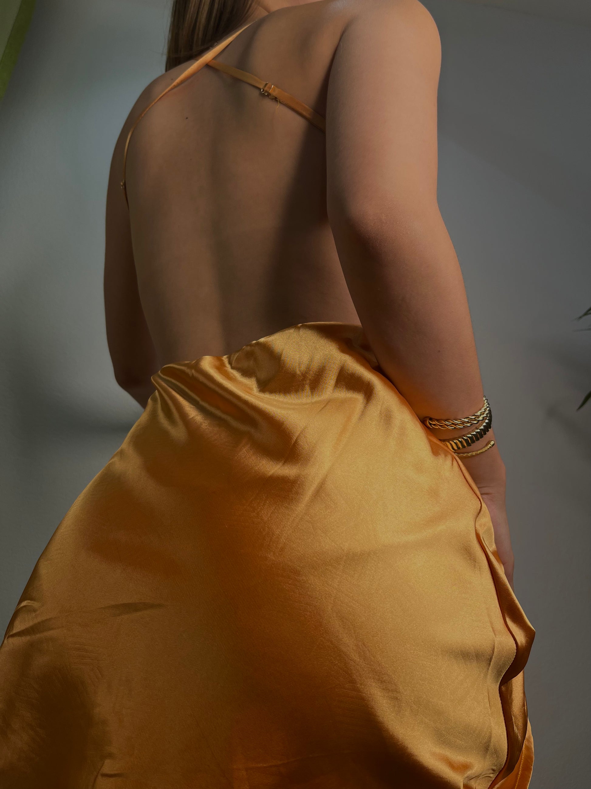 Bright orange satin dress with open back. Runs to size. Model is wearing a size small.
